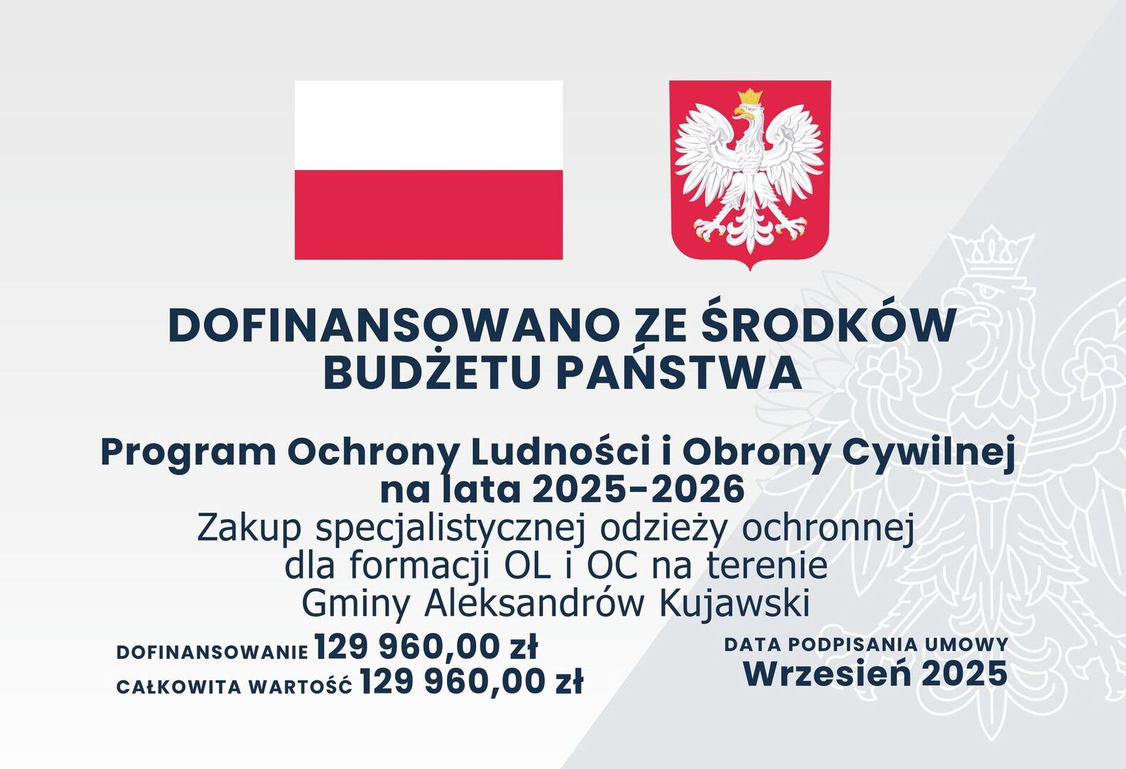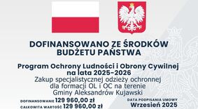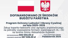 Wójt Gminy Aleksandrów Kujawski Andrzej Olszewski informuje, że w ramach realizacji programu Ochrony Ludności i Obrony Cywilnej na lata 2025/2026 Gmina Aleksandrów Kujawski w 2025 r. pozyskała dofinasowania i zrealizowała następujące zadania: